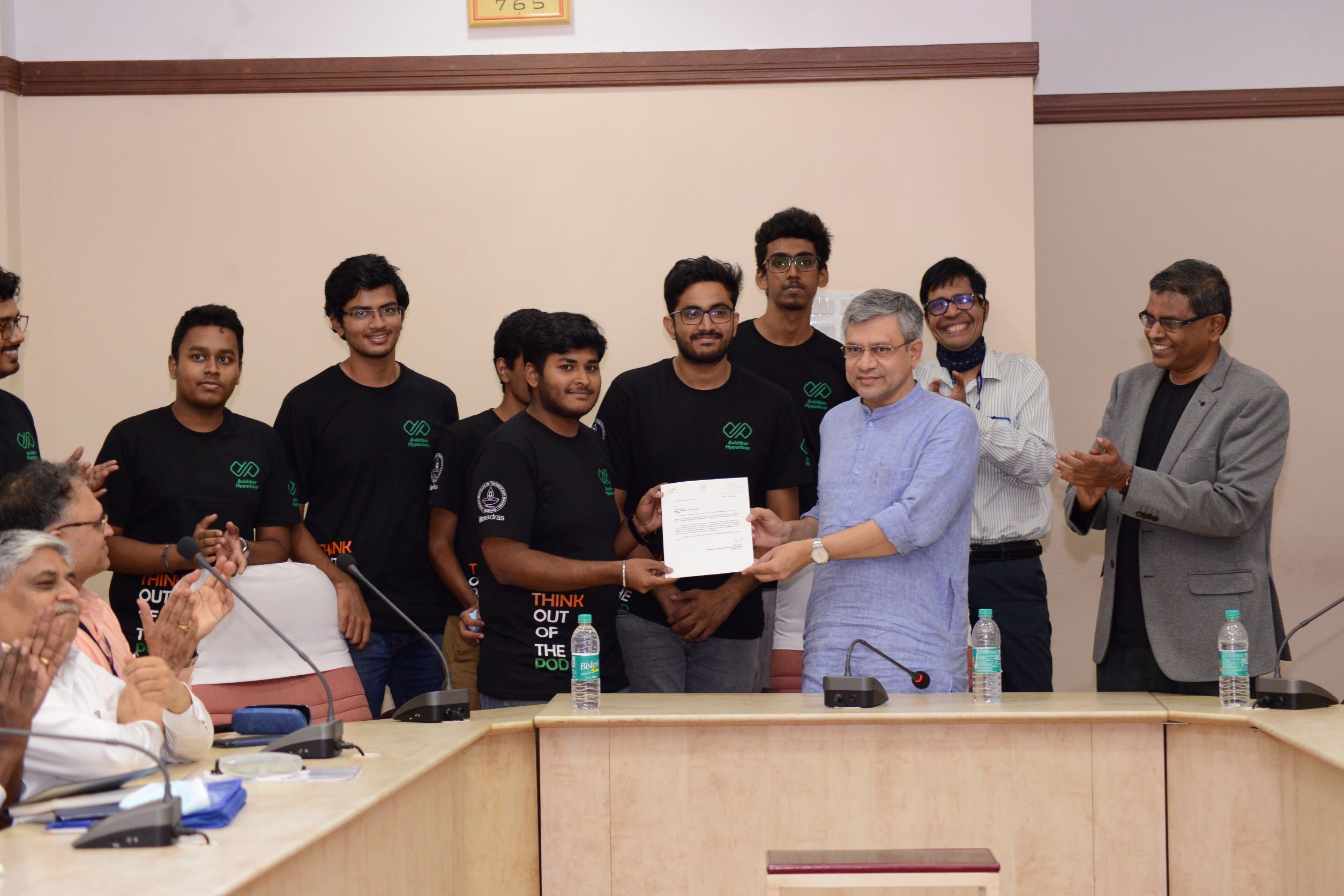 On the aforementioned historic day, Shri Ashwini Vaishnaw, the Hon’ble Minister of Railways, Communication and Electronics and Information Technology graced us with his presence at the Centre for Innovation (CFI) at IIT Madras. Our Director, Professor Kamakoti and our Faculty Advisor, Professor Satya Chakravarty took the Minister on a tour of our workspace, where our team demonstrated various technologies under development to the Minister. Impressed by our work, and to our surprise and jubilation, he announced the government’s all-round support for the project.